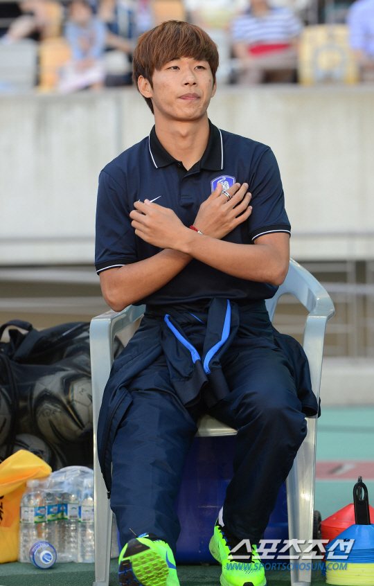 이광종 감독이 이끄는 아시안게임 남자축구대표팀이 21일 화성종합경기타운에서 라오스와 A조 조별리그 최종전을 벌였다. 사우디와의 경기에서 부상을 당한 윤일록이 벤치에 앉아있다.