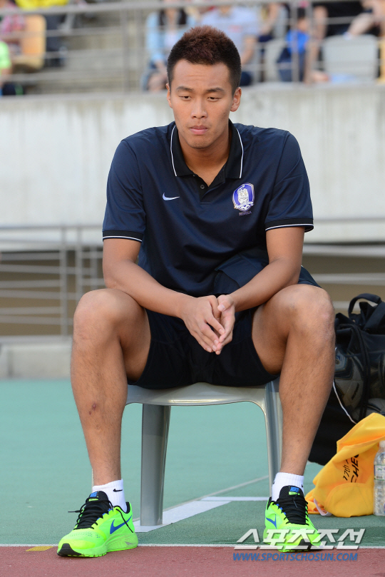 이광종 감독이 이끄는 아시안게임 남자축구대표팀이 21일 화성종합경기타운에서 라오스와 A조 조별리그 최종전을 벌였다. 사우디와의 경기에서 부상을 당한 김신욱이 벤치에 앉아있다.