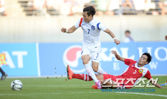 이광종 감독이 이끄는 아시안게임 남자축구대표팀이 21일 화성종합경기타운에서 라오스와 A조 조별리그 최종전을 벌였다. 안용우가 골문으로 파고들다 라오스 수비수의 태클에 걸려 넘어지고 있다.