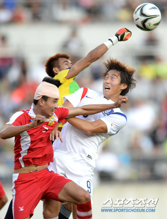 이광종 감독이 이끄는 아시안게임 남자축구대표팀이 21일 화성종합경기타운에서 라오스와 A조 조별리그 최종전을 벌였다. 한국 이용재가 헤딩슛을 시도했지만 라오스 골키퍼가 펀칭으로 공을 걷어내고 있다.