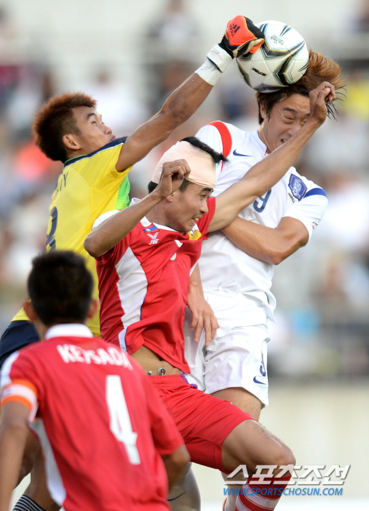 이광종 감독이 이끄는 아시안게임 남자축구대표팀이 21일 화성종합경기타운에서 라오스와 A조 조별리그 최종전을 벌였다. 한국 이용재가 헤딩슛을 시도했지만 라오스 골키퍼가 펀칭으로 공을 걷어내고 있다.