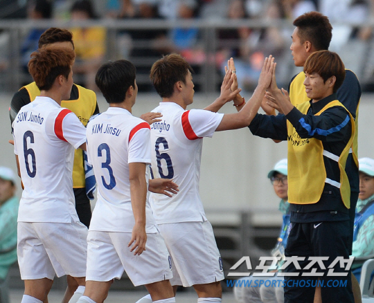이광종 감독이 이끄는 아시안게임 남자축구대표팀이 21일 화성종합경기타운에서 라오스와 A조 조별리그 최종전을 벌였다. 한국 이종호가 선제골을 넣은 후 부상으로 빠진 윤일록에게 달려가 위로의 포옹을 하고 있다.