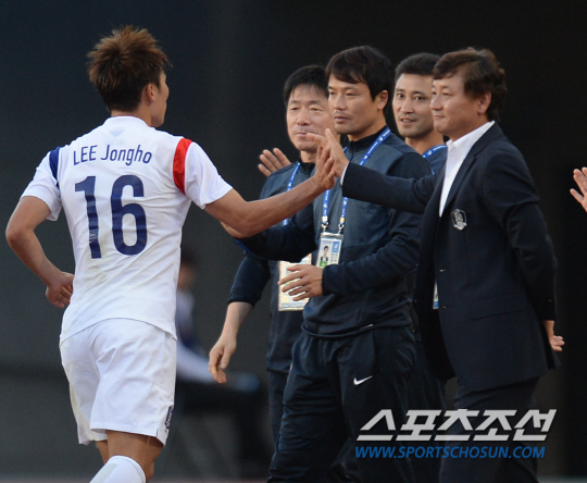 이광종 감독이 이끄는 아시안게임 남자축구대표팀이 21일 화성종합경기타운에서 라오스와 A조 조별리그 최종전을 벌였다. 한국 이종호가 선제골을 넣은 후 벤치로 달려가 이광종 감독의 축하를 받고 있다.