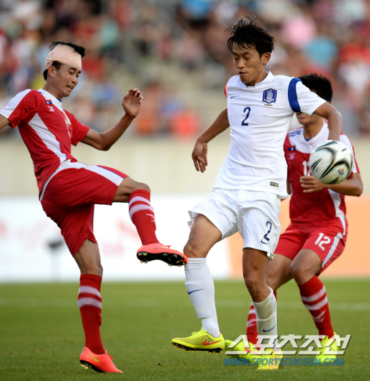 이광종 감독이 이끄는 아시안게임 남자축구대표팀이 21일 화성종합경기타운에서 라오스와 A조 조별리그 최종전을 벌였다. 한국 최성근이 라오스 문전으로 파고들다 상대 수비수에 막히고 있다.