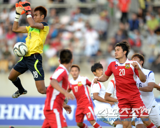 이광종 감독이 이끄는 아시안게임 남자축구대표팀이 21일 화성종합경기타운에서 라오스와 A조 조별리그 최종전을 벌였다. 라오스 순달라 골키퍼가 공을 잡으려다 놓치고 있다.