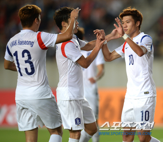 이광종 감독이 이끄는 아시안게임 남자축구대표팀이 21일 화성종합경기타운에서 라오스와 A조 조별리그 최종전을 벌였다. 김승대(오른쪽)가 후반 막판 2-0으로 앞서는 추가골을 넣은 후 기뻐하고 있다.