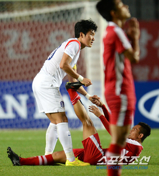 이광종 감독이 이끄는 아시안게임 남자축구대표팀이 21일 화성종합경기타운에서 라오스와 A조 조별리그 최종전을 벌였다. 한국이 2-0의 승리를 거둔 가운데 장현수가 다리에 쥐가 난 라오스 선수를 도와주고 있다.