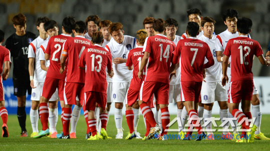 이광종 감독이 이끄는 아시안게임 남자축구대표팀이 21일 화성종합경기타운에서 라오스와 A조 조별리그 최종전을 벌였다. 한국이 2-0의 승리를 거둔 가운데 양팀 선수들이 악수를 나누고 있다.