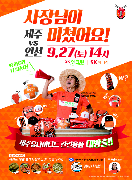 27일 제주월드컵경기장에서 열리는 인천과의 제주 홈경기 포스터에 낯선 얼굴이 등장했다. 제주는 '사장님이 미쳤어요!'라는 컨셉트 아래 유니폼, 사인볼, 점퍼, 머플러, 모자, 가방 등 제주 관련 용품을 파격가에 판매한다. 재고를 정리함과 동시에 관중들에게 더 많은 제주 용품을 제공하기 위해 마련한 이벤트다. 관중들이 제주 용품을 싸게 구할 수 있는 기회를 주면서 제주의 색인 오렌지색으로 경기장을 물들이기 위한 묘수다.