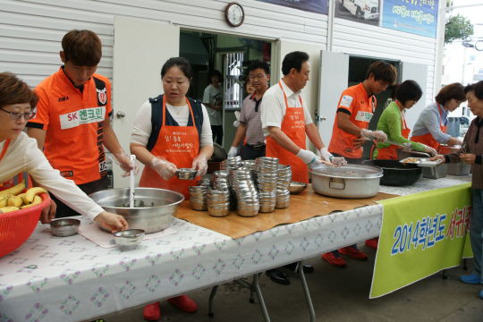 제주 유나이티드(SK 에너지 축구단)가 '참! 좋은 사랑의 밥차'를 통해 따뜻한 이웃사랑을 실천했다.