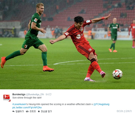 | 분데스리가 공식 SNS가 손흥민의 결승골에 '빗속을 꿰뚫은 손샤인'이라며 환호했다. ⓒBundesliga |