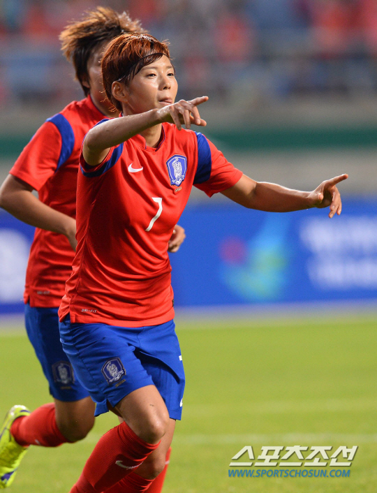 한국여자축구대표팀과 대만여자축구대표팀의 2014인천아시안게임 8강전 경기가 26일 인천문학축구장에서 열렸다. 한국의 전가을이 팀의 첫번째 골을 성공시키고 동료들과 환호하고 있다.
