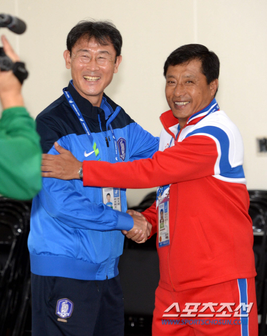 2014 인천 아시안게임 여자축구 남북전이 준결승전에서 성사됐다. 내일 펼쳐질 4강전 남북전에 앞서 한국 윤덕여 감독과 북한 김광민 감독이 28일 인천 문학경기장에서 기자회견을 가졌다. 기자회견에 앞서 인사를 나누며 밝은 미소를 짓는 두 감독의 모습.