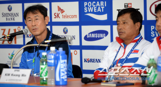 2014 인천 아시안게임 여자축구 남북전이 준결승전에서 성사됐다. 내일 펼쳐질 4강전 남북전에 앞서 한국 윤덕여 감독과 북한 김광민 감독이 28일 인천 문학경기장에서 기자회견을 가졌다. 질문에 답하는 윤덕여 감독의 모습.