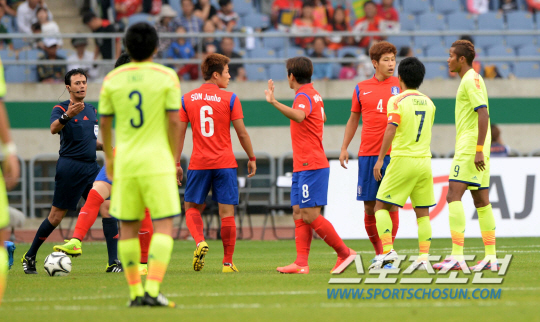 역대 7번째 아시안게임 축구 한일전이 펼쳐졌다. 28일 인천 문학경기장에서 열린 2014 인천 아시안게임 축구 한국과 일본의 경기 8강전 경기에서 양팀 선수들이 신경전을 벌이고 있다.