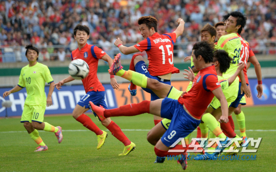 역대 7번째 아시안게임 축구 한일전이 펼쳐졌다. 28일 인천 문학경기장에서 열린 2014 인천 아시안게임 축구 한국과 일본의 경기 8강전 경기에서 이용재가 발리슛을 시도하고 있다.