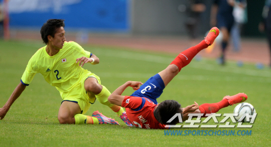 역대 7번째 아시안게임 축구 한일전이 펼쳐졌다. 28일 인천 문학경기장에서 열린 2014 인천 아시안게임 축구 한국과 일본의 경기 8강전 경기에서 김진수가 무로야와 볼을 다투다 넘어지고 있다.