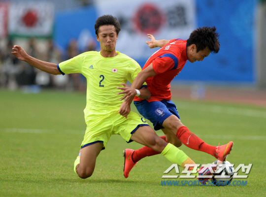역대 7번째 아시안게임 축구 한일전이 펼쳐졌다. 28일 인천 문학경기장에서 열린 2014 인천 아시안게임 축구 한국과 일본의 경기 8강전 경기에서 김진수가 무로야와 볼을 다투다 넘어지고 있다.