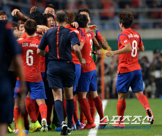 역대 7번째 아시안게임 축구 한일전이 펼쳐졌다. 28일 인천 문학경기장에서 열린 2014 인천 아시안게임 축구 한국과 일본의 경기 8강전 경기에서 후반, 장현수가 페널티킥 선취골을 터뜨린 후 기뻐하고 있다.