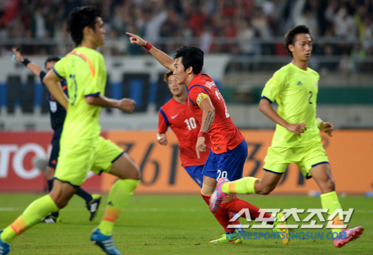 역대 7번째 아시안게임 축구 한일전이 펼쳐졌다. 28일 인천 문학경기장에서 열린 2014 인천 아시안게임 축구 한국과 일본의 경기 8강전 경기에서 후반, 장현수가 페널티킥 선취골을 터뜨리고 있다.