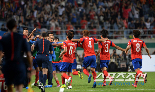 역대 7번째 아시안게임 축구 한일전이 펼쳐졌다. 28일 인천 문학경기장에서 열린 2014 인천 아시안게임 축구 한국과 일본의 경기 8강전 경기에서 후반, 장현수가 페널티킥 선취골을 터뜨린 후 기뻐하고 있다.