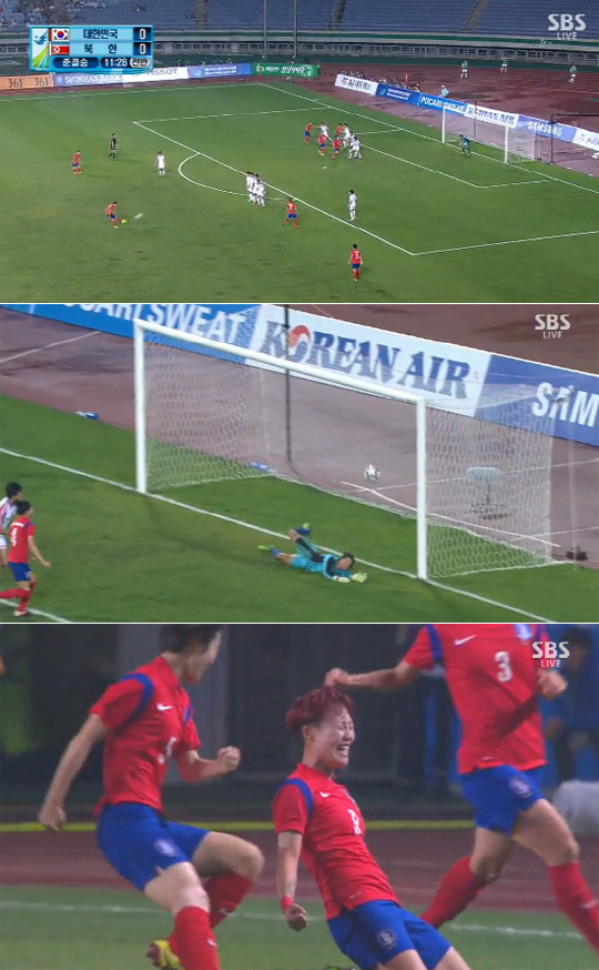 하지만 전반 35분 북한의 동점골이 터졌다. 골문 오른쪽에서 게 연결된 크로스를 한국 수비진이 제대로 처리하지 못한 사이 북한의 리혜경이 동점골을 만들어냈다.
