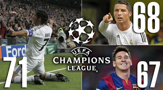 현 기록 보유자인 '챔피언스리그의 사나이' 라울 곤살레스(37·알 사드)의 기록은 142경기 71골이다. 하지만 104경기 68골의 호날두와는 단 3골 차이인데다, 67골의 메시도 그 뒤를 따르고 있다. 곤살레스의 기록이 깨지는 것은 시간문제인 셈. 아직 현역 생활을 이어가고 있는 곤살레스로선 후배들의 바쁜 추격이 씁쓸할 듯 하다.