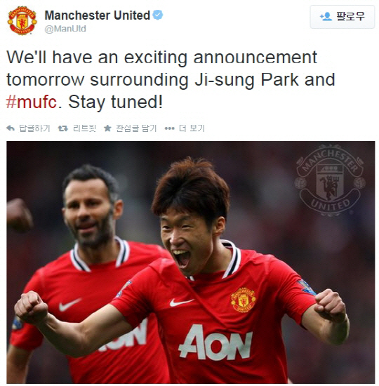 특히 맨유는 글과 함께 박지성이 라이언 긱스 현 코치를 뒤에 두고 골을 넣고 환호하는 맨유 시절 경기 사진을 함께 게재해 기대감을 더욱 높였다.