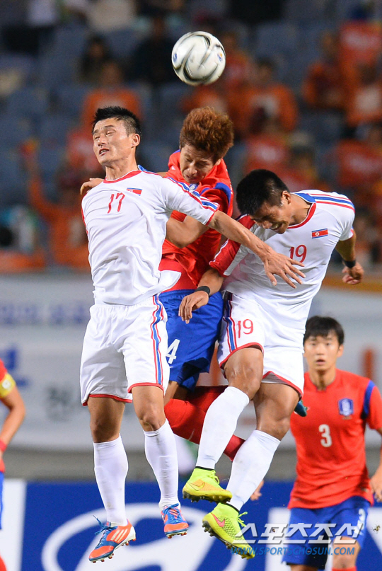 대한민국 축구대표팀과 북한 축구대표팀의 2014인천아시안게임 축구결승전이 2일 인천문학축구장에서 열렸다. 한국의 김진수가 북한의 서현욱, 박광룡과 치열한 볼경합을 벌이고 있다.