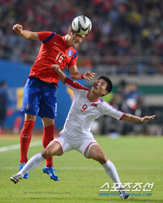 대한민국 축구대표팀과 북한 축구대표팀의 2014인천아시안게임 축구결승전이 2일 인천문학축구장에서 열렸다. 한국의 임창우와 북한의 림광혁이 치열한 볼경합을 벌이고 있다.