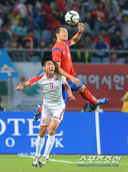 대한민국 축구대표팀과 북한 축구대표팀의 2014인천아시안게임 축구결승전이 2일 인천문학축구장에서 열렸다. 한국의 임창우와 북한의 림광혁이 치열한 볼경합을 벌이고 있다.
