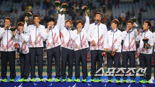 대한민국 축구대표팀 선수들이 2일 인천문학축구장에서 열린 2014인천아시안게임 축구결승전에서 북한을 상대로 승리하고 금메달을 목에 걸고있다.