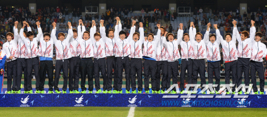 대한민국 축구대표팀 선수들이 2일 인천문학축구장에서 열린 2014인천아시안게임 축구결승전에서 북한을 상대로 승리하고 금메달을 목에 걸고있다.