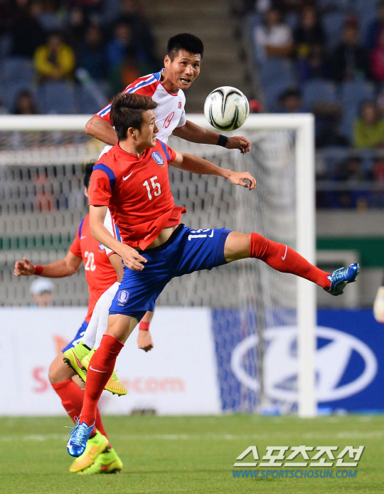 대한민국 축구대표팀과 북한 축구대표팀의 2014인천아시안게임 축구결승전이 2일 인천문학축구장에서 열렸다. 한국의 임창우와 북한의 림광혁이 치열한 볼경합을 벌이고 있다.
