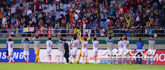 30일 오후 인천 문학경기장에서 2014 인천 아시안게임 축구 남자 4강 한국과 태국의 경기가 열렸다. 2대0으로 승리하며 결승행이 확정된 후 한국 선수들이 관중들에게 인사하고 있다. 인천= 김경민 기자 kyungmin@sportschosun.com / 2014.09.30.