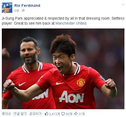 퍼디낸드는 2일 자신의 SNS에 "박지성은 드레싱룸의 모두가 그 진가를 알고 존중해주는 선수였다. 가장 이타적인 선수였다. 박지성이 맨유에 돌아온 것을 진심으로 환영한다"라는 글을 남겼다.