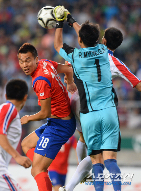 대한민국 축구대표팀과 북한 축구대표팀의 2014인천아시안게임 축구결승전이 2일 인천문학축구장에서 열렸다. 한국 김신욱이 북한 골키퍼 리명국과 치열한 볼경합을 벌이고 있다. 인천=최문영 기자 deer@sportschosun.com /2014.10.02/