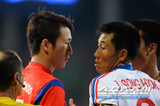 대한민국 축구대표팀과 북한 축구대표팀의 2014인천아시안게임 축구결승전이 2일 인천문학축구장에서 열렸다. 한국의 임창우와 북한의 장송혁이 신경전을 벌이고 있다. 인천=최문영 기자 deer@sportschosun.com /2014.10.02/