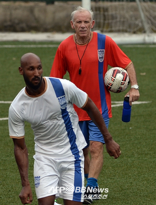 | ◇ISL 뭄바이시티에 입단한 니콜라스 아넬카(왼쪽)가 지난 1일(한국시각) 인도 뭄바이의 쿠퍼레이지 가든에서 영국 출신의 피터 레이드 감독이 지켜보는 가운데 팀 훈련을 실시하고 있다. 뭄바이(인도)=ⓒAFPBBNews = News1 |