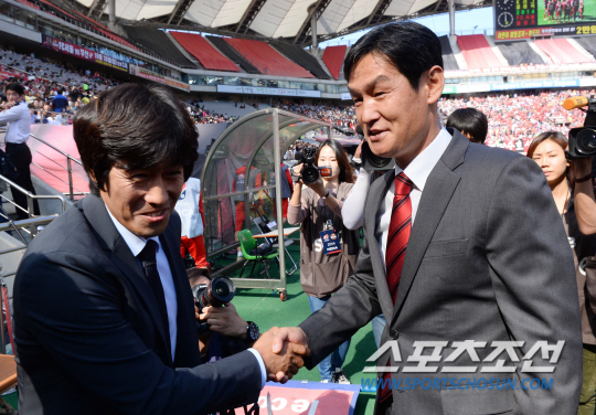 2014 프로축구 K리그 클래식 30라운드 FC서울과 수원삼성의 경기가 5일 서울월드컵경기장에서 열렸다. 서울의 최용수 감독가 수원의 서정원 감독이 경기전 인사를 나누고 있다. 상암=최문영 기자 deer@sportschosun.com /2014.10.05/