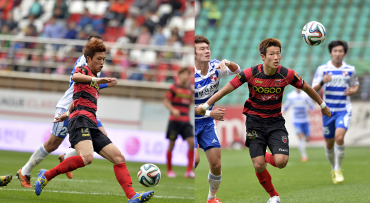 5일 포항 스틸야드에서 펼쳐진 포항-부산 간의 2014년 현대오일뱅크 K-리그 클래식 30라운드. 3일 전 이광종호에서 금메달의 환희를 맛봤던 김승대(23)와 손준호(22)는 포항 선발 라인업에 나란히 이름을 올렸다. 김승대는 최전방 원톱, 손준호는 섀도 스트라이커 자리에 이름을 올렸다. 두 선수는 지난 한달 간 이광종호에서 조별리그부터 결승전까지 7경기를 뛰었다. 모든 힘을 쏟았다. 체력 부담이 만만치 않았다.