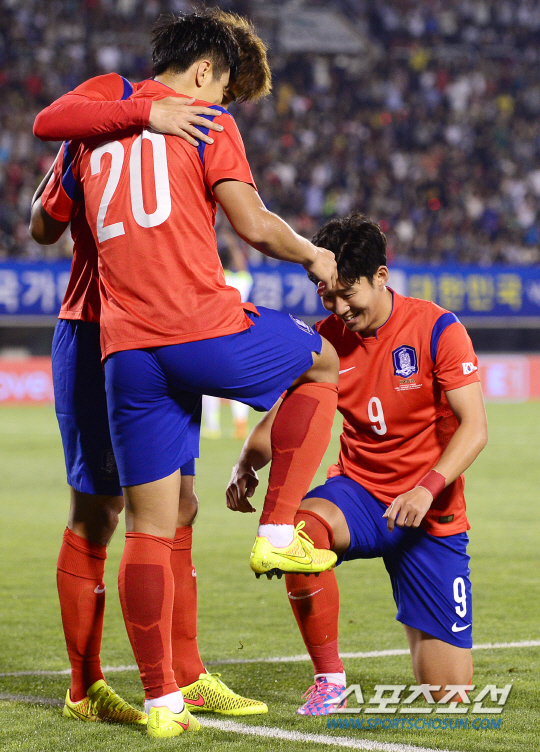 신태용 코치가 이끄는 축구대표팀이 5일 오후 부천종합운동장에서 FIFA 랭킹 29위의 베네수엘라와 친선경기를 벌였다. 한국 이동국이 후반 초반 멋진 헤딩슛으로 2-1 역전골을 넣자 손흥민이 달려와 '구두닦이' 세리머니를 하고 있따. 부천=정재근 기자cjg@sportschosun.com/2014.09.05/