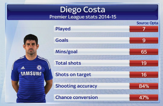 게다가 올시즌 쏜 19개의 슈팅 중 무려 16개가 유효슈팅일 만큼 매서운 발끝을 자랑한다. 슛정확도가 무려 84%에 달한다. 골키퍼의 선방 외에는 코스타의 골 행진을 막을 방법이 없는 셈이다.