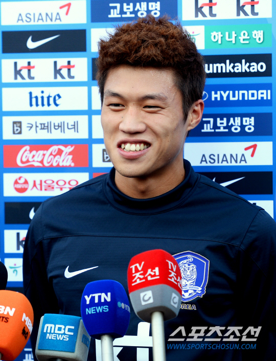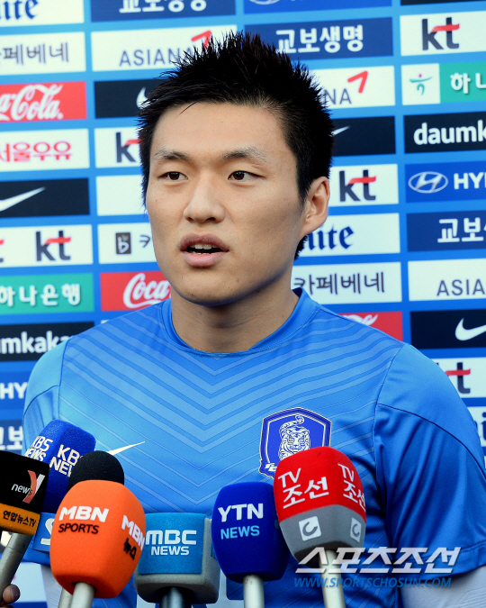 8일 파주 축구 트레이닝 센터(NFC)에서 슈틸리케 감독이 이끄는 축구 대표팀 선수들이 두 번째 훈련을 했다. 김승대가 훈련 전 취재진과 인터뷰에 응하고 있다. 축구대표팀은 10일 파라과이(천안), 14일 코스타리카(상암)와 평가전을 치른다. 파주=정재근 기자 cjg@sportschosun.com