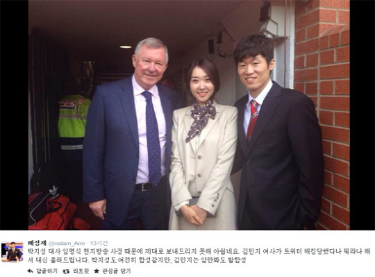 박지성 김민지 퍼거슨 셀카에 네티즌들은 "박지성 김민지 퍼거슨, 정말 잘 나왔어", "박지성 김민지 퍼거슨, 미소 만개", "박지성 김민지 퍼거슨, 보기 좋아", "박지성 김민지 퍼거슨, 친해 보이네" 등의 다양한 반응을 보이고 있다. <스포츠조선닷컴>
