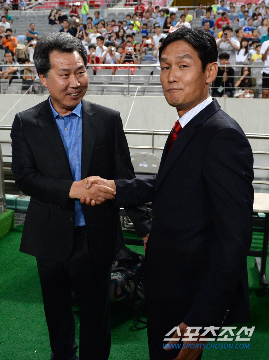 6일 서울 상암동 서울월드컵경기장에서 K리그 클래식 19라운드 FC서울과 울산현대의 경기가 열렸다. 경기 전 최용수 감독과 조민국 감독(왼쪽)이 악수를 나누고 있다. 상암=송정헌 기자 songs@sportschosun.com/2014.08.06