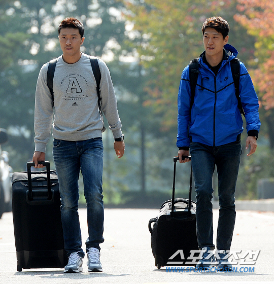 ◇박종우(왼쪽)와 이청용이 7일 파주NFC에 소집된 A대표팀에 합류하기 위해 짐을 들고 걸어 들어오고 있다. 파주=정재근 기자 cjg@sportschosun.com