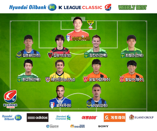 프로연맹은 30라운드 베스트 11도 공개됐다. 이보(이천)와 로저(수원)가 최고의 공격수로 뽑힌 가운데 베스트 미드필더에는 황일수 윤빛가람(이상 제주) 레안드리뉴(전남) 한교원(전북)이 차지했다. 최고의 수비는 최철순 윌킨슨(이상 전북) 김광석(포항) 김용환(인천), 수문장은 정성룡이었다.
