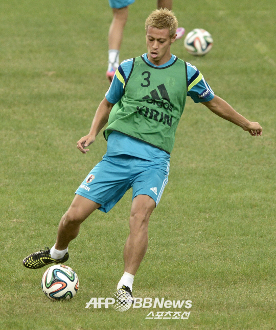| 일본 대표팀 미드필더 혼다가 브라질 전을 하루 앞두고 13일 싱가포르 국립경기장에서 훈련하고 있다. ⓒAFPBBNews = News1 |