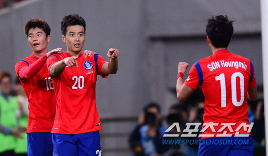 14일 오후 서울 상암월드컵구장에서 한국 축구국가대표팀과 코스타리카의 평가전이 열렸다. 전반 동점골을 터트린 이동국이 어시스트를 한 손흥민과 기뻐하고 있다. 상암=김경민 기자 kyungmin@sportschosun.com / 2014.10.14.